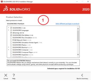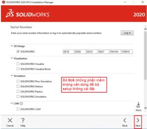Bỏ tick những phần mềm bạn không dùng đến và SOLIDWORKS bắt buộc phải có rồi nhấn Next.