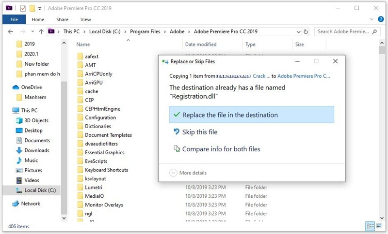 Copy file Registration.dll vào thư mục cài đặt Premiere Pro CC 2019